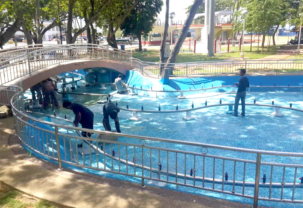 All the pumps and lights are controlled by a control panel. With the correct adjustment on the panel, a colorful water and lights show is achieved to the enjoyment of the public.